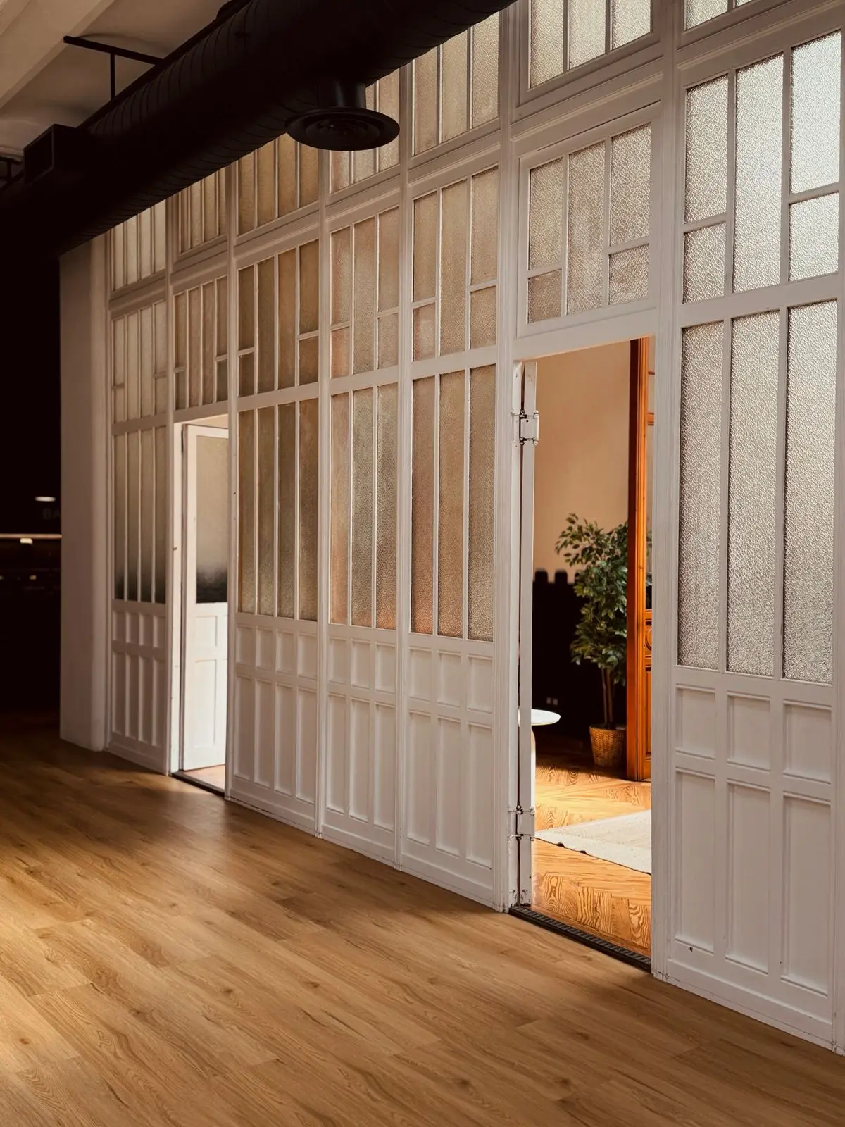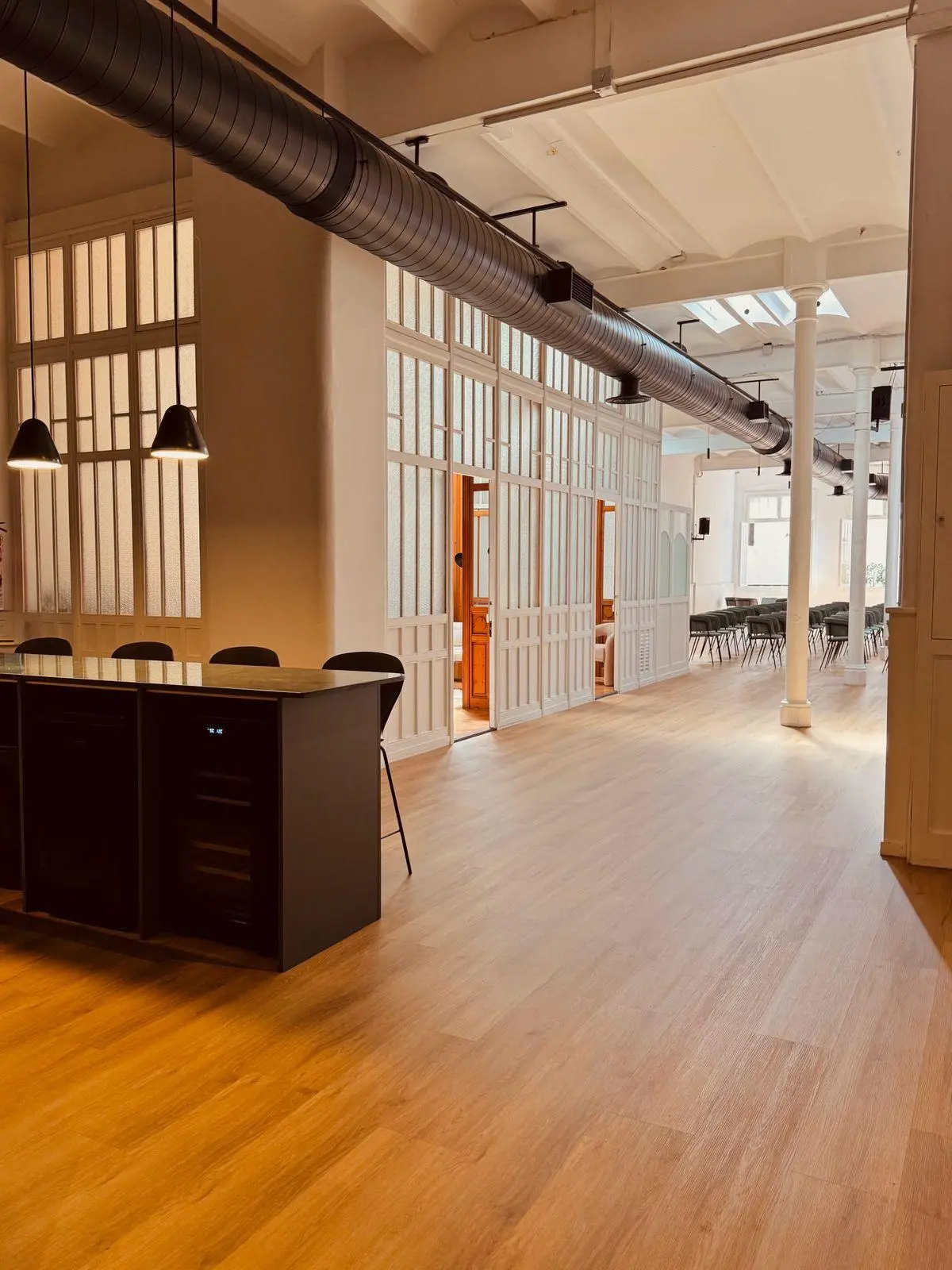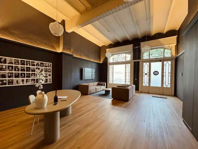 El terra d’acabat en fusta, la il·luminació regulable i els materials nobles aporten calidesa, elegància i funcionalitat. La seva versatilitat també el fa adequat com a plató per a produccions fotogràfiques o audiovisuals, instal·lacions performàtiques o sessions de treball a gran escala.
